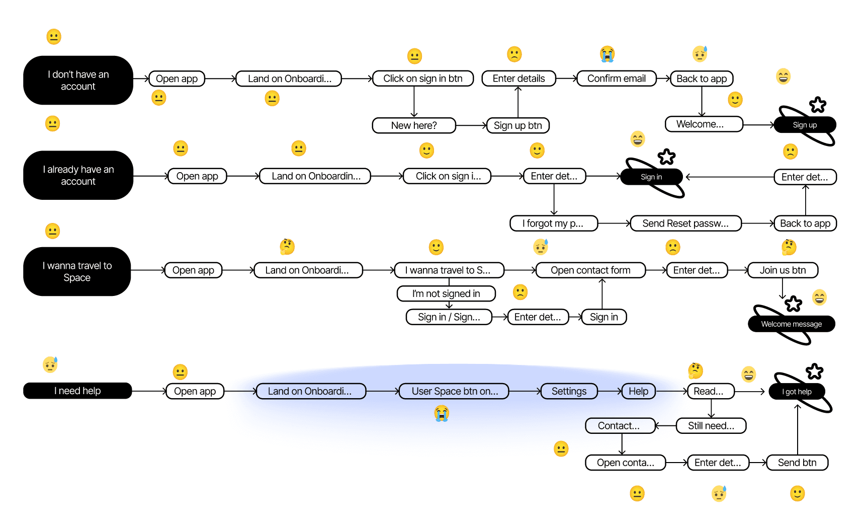 First User Flows: Tracked the user's first flows when accessing the app and pointed out their emotional touchpoints.